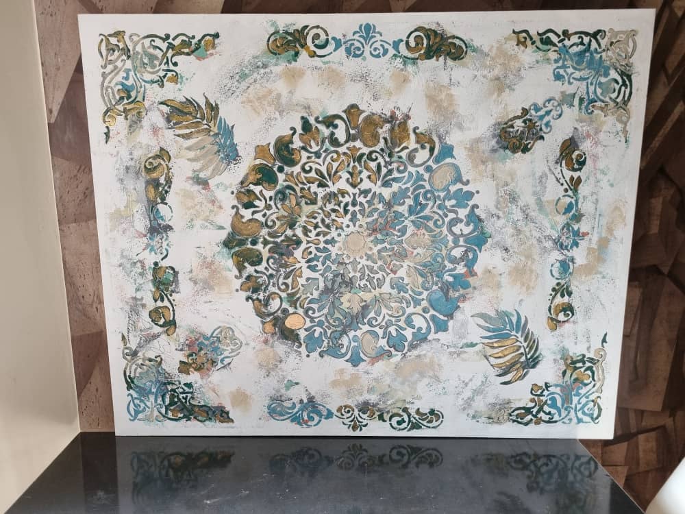 این تابلو روی بوم دیپ در اندازه ۱۰۰ در ۸۰ با رنگهای فیروزه ای نقره ای طوسی و کمی آجری پتینه شده است رنگ بسیار ملیح و مناسب هر محیطی است.