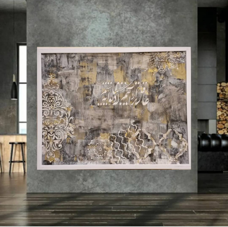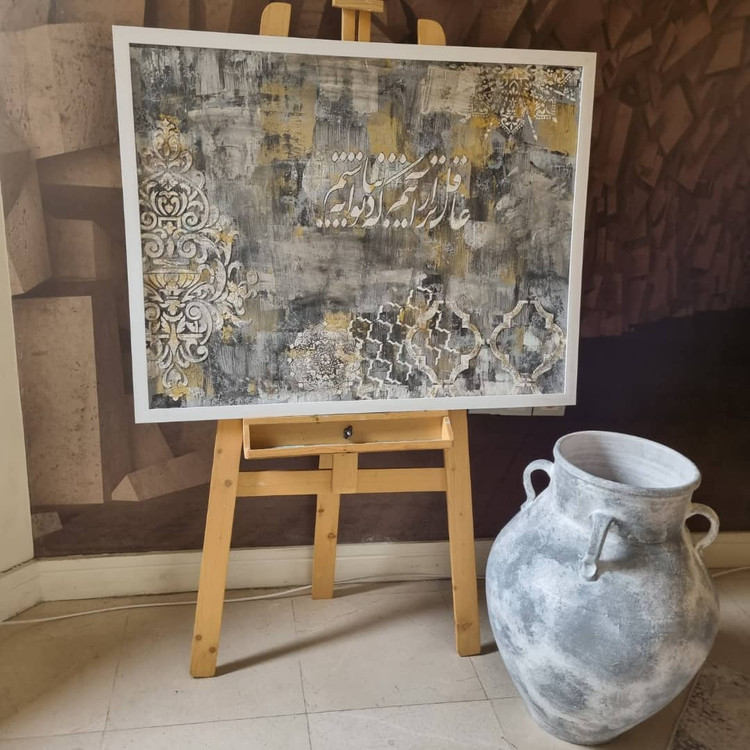 این تابلو در اندازه ۱۰۰ در ۷۰ با قاب سفید جزء تابلوهای پتینه روی چوب ام دی اف اجرا شده است متن داخل آن «عاقل تر از آنیم که دیوانه نباشیم» است طرح های روی آن از طرحهای سنتی ایرانی محسوب میشود